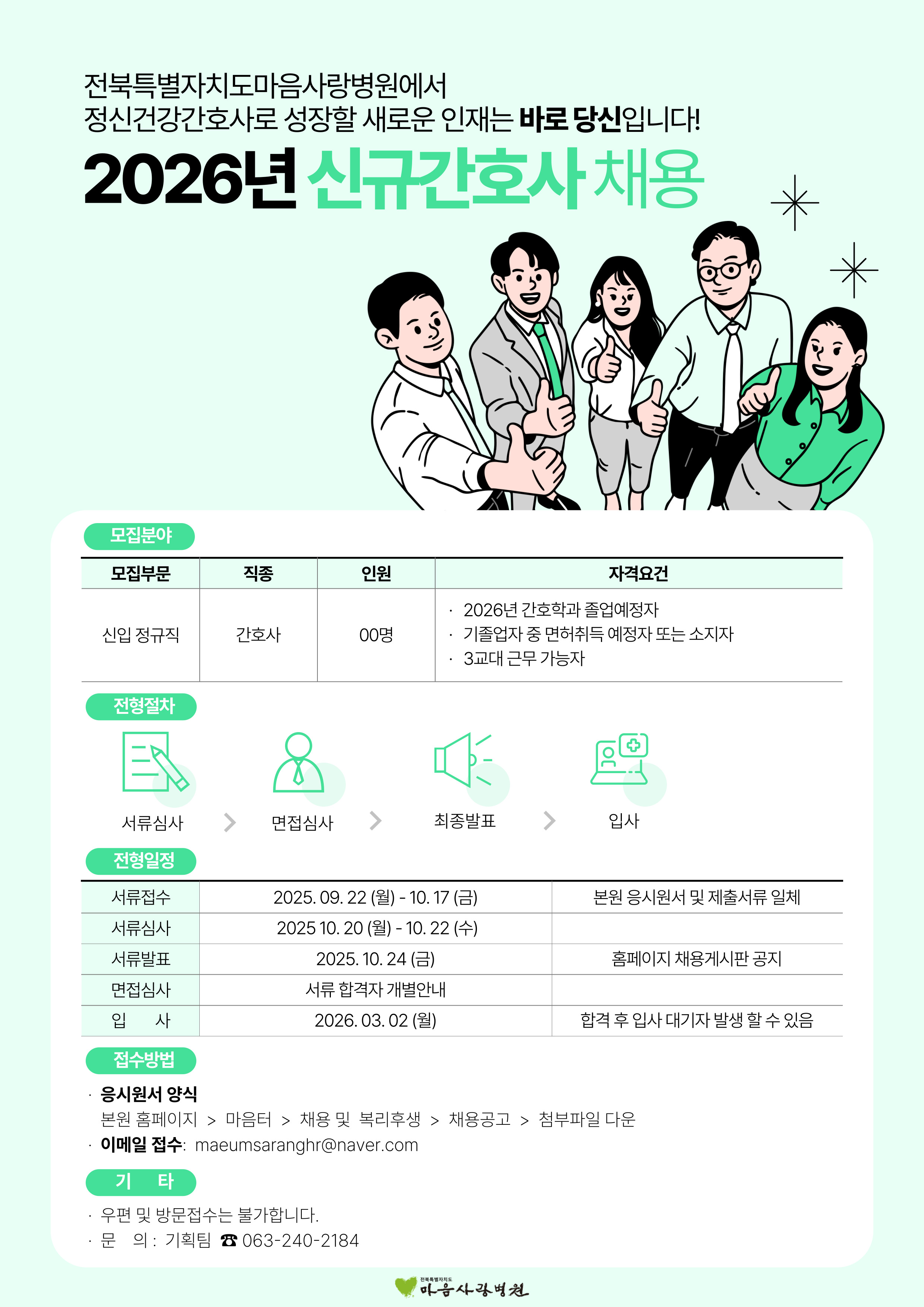 채용문의 : 마음사랑병원 기획팀 (Tel. 063-240-2184, 2280~1)